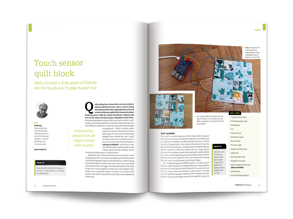 There’s loads going on in this issue: first of all, how about using a capacitive touch board and Raspberry Pi 5 to turn a quilt into an input device? Nicola King shows you how.