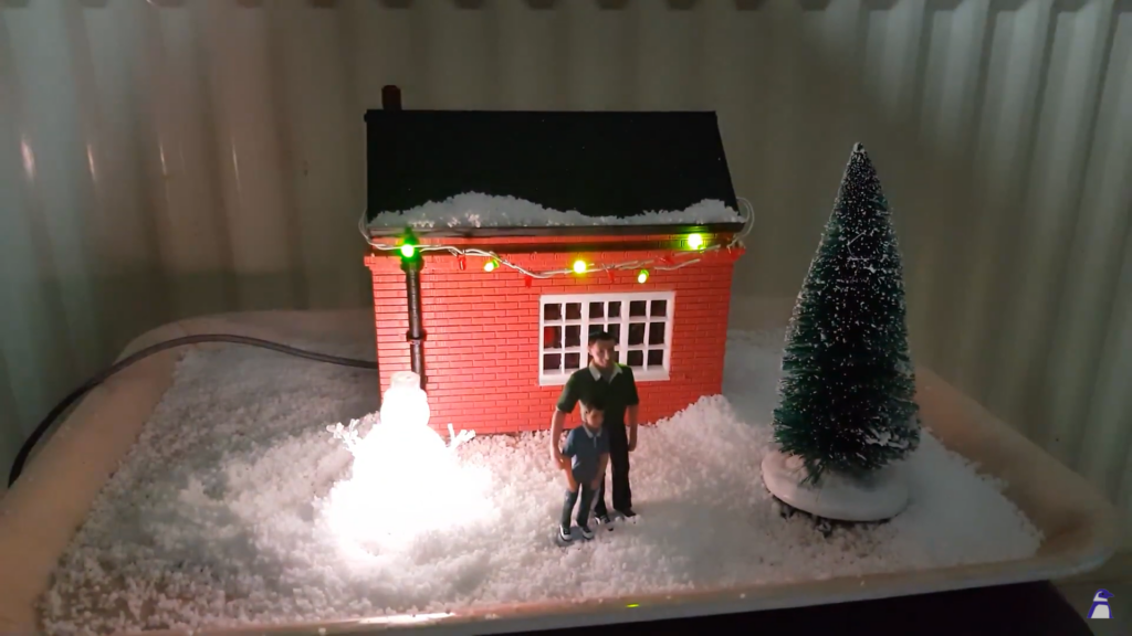 This little diorama was created by Stewart Watkiss (aka PenguinTutor) to be part of an outdoor railway. However, it also functions as an indoor decoration. A string of LEDs on the front of the building act as some nice Christmas lights, and a snowman has NeoPixels inside so it can glow with awesome Christmas power. The house and snowman were 3D-printed, although you could probably find some model kits that will allow you to do similar. We like the snow effect on the tray, and the little tree and people to give it the correct sense of scale. magpi.cc/xmashouse