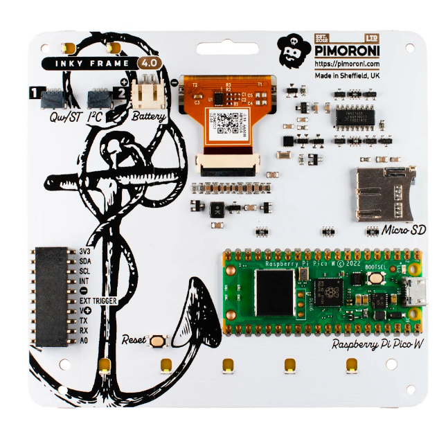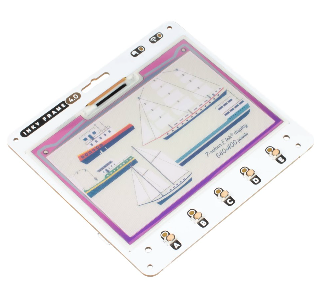 Display: 4.01-inch e-ink, 640×400, seven colours Features: Pico W, 5 × user buttons, reset button, LEDs, microSD card slot, breakout header, 2 × Qwiic/STEMMA QT ports, 2 × metal legs Dimensions: 102.8 × 96.7 mm