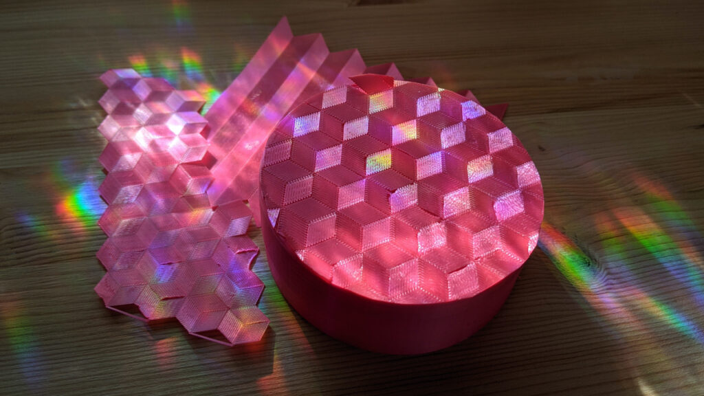 “So this is a recent project – I found a way to force the tool path to make interesting textures on flat surfaces, which I thought was pretty neat, especially as you can’t do that with any traditional media; you can’t put a glitter on there and have it end up looking like this.