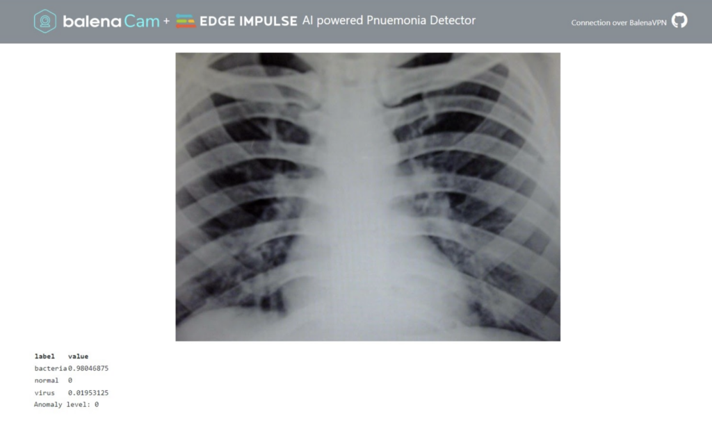 “The system consists of a Raspberry Pi 4, along with a Raspberry Pi Camera,” he says. “From the software side of things, we have two Docker containers running the balenaCAM and the Edge Impulse machine learning model on top of balenaOS running on Raspberry Pi. The user just has to place a chest X-ray or an image of it in front of the camera and open up http://localhost:4912 in a [browser]. After two-three seconds, the live camera feed will appear in the dashboard and show what type of pneumonia has the person [contracted] with percentages!”
