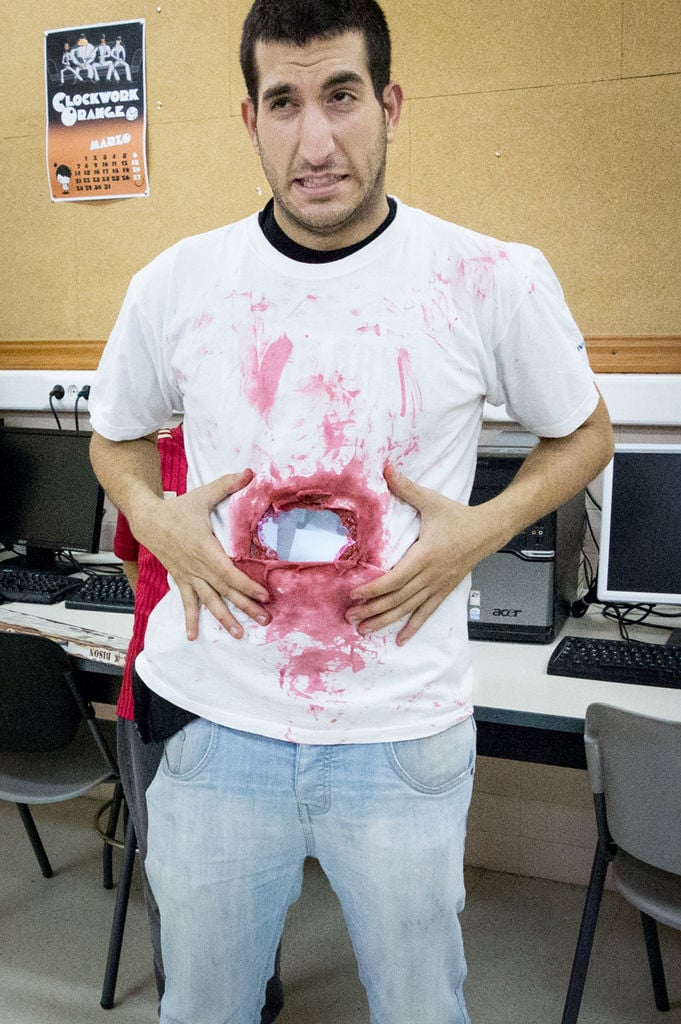 We interviewed Luis Martin Nuez about this blood-curdling costume idea a few years ago. It’s very basically a Raspberry Pi with a Camera Module that displays what it sees on the screen live. The camera is attached to his back, with the screen on his stomach, and the preview mode is used to create the illusion that he has been shot through the stomach. Grisly.