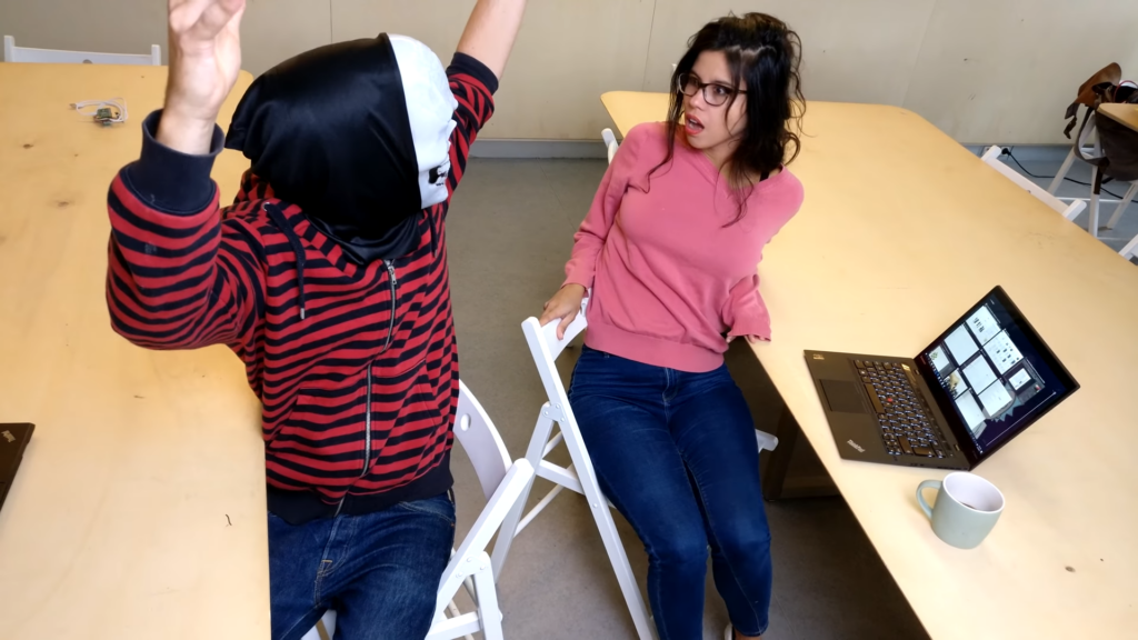 Estefannie Explains It All used several technologies to power this suit, including Arduino supplies to power LEDs around the suit, a voice changer to giver herself a more robotic persona, and a Raspberry Pi to power the screen on the chest with several functions which are powered by a series of buttons. The jaw even moves depending on how she speaks!