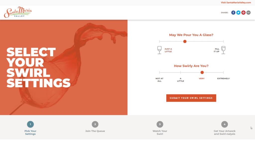 “It was created and developed by KPS3 for Visit Santa Maria Valley. The machine allows users to select their ‘Fill Level’ and ‘Swirl Speed’. In real-time, the user can watch the glass fill, swirl, and splash the wine onto a piece of paper, creating an original Santa Maria-style spill artwork. Every swirl and spill will be unique to each individual user” say Rob Gaedtke and Jonathan Rutheiser of its marketing agency KPS3.
